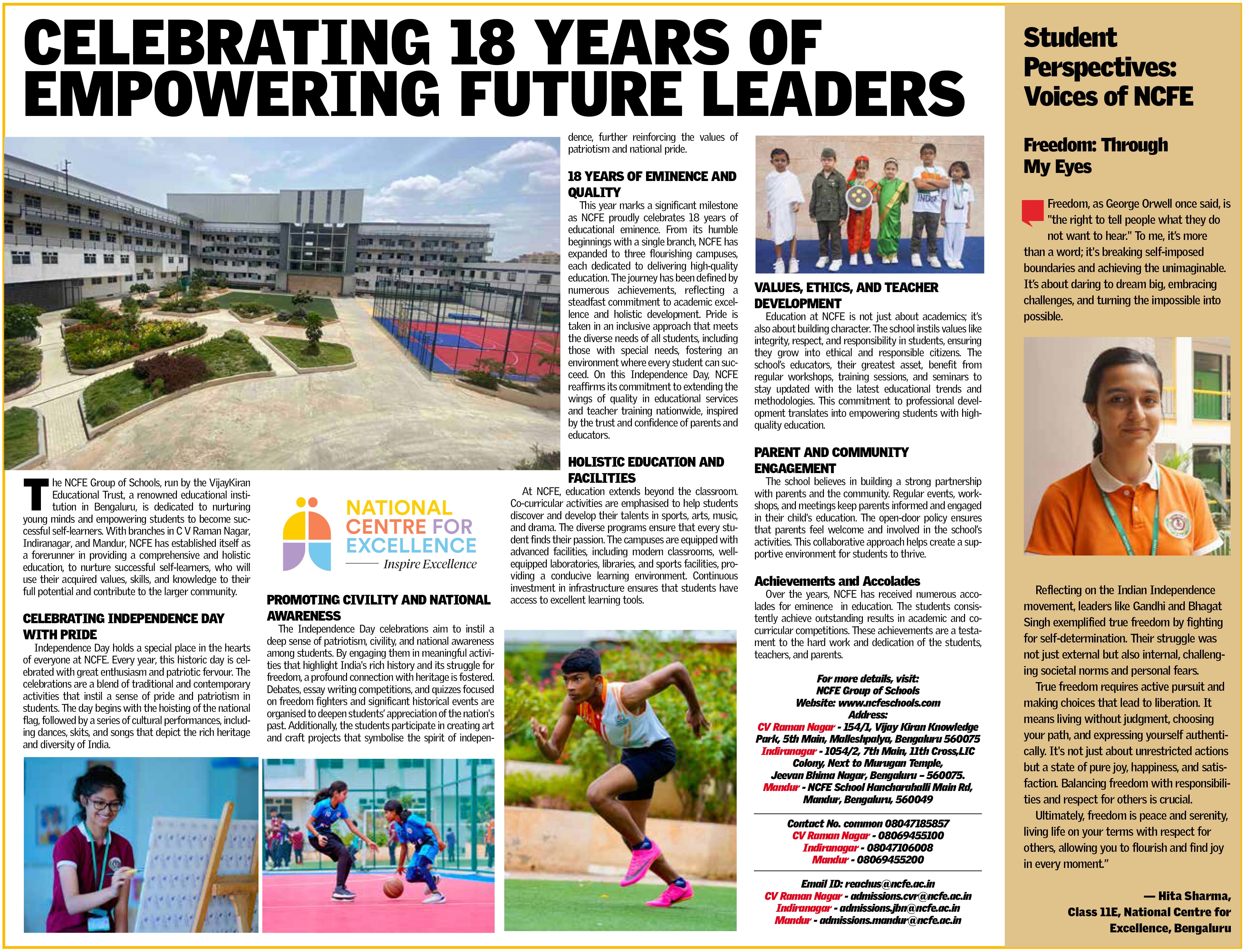 For over 18 years, the National Centre for Excellence (NCFE), CV Raman Nagar has been one of the leaders in delivering quality education. Going beyond textbooks and classrooms—the school seeks to spark curiosity, inspire innovation, and nurture the love of learning. At NCFE, students don’t just learn, they thrive academically, creatively and personally.