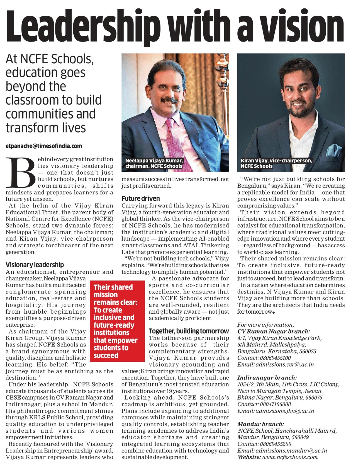 At the helm of the Vijay Kiran Educational Trust, the parent body of National Centre for Excellence (NCFE) Schools, stand two dynamic forces: Neelappa Vijaya Kumar, the chairman, and Kiran Vijay, vice-chairperson and strategic torchbearer of the next generation.